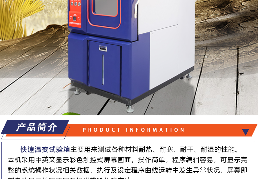 用途:快速溫變試驗箱主要用來測試各種材料耐熱、耐寒、耐干、耐濕的性能。本機采用中英文顯示彩色觸控式屏幕畫面,操作簡單,程序編輯容易,可顯示完整的系統操作狀況相關數據、執