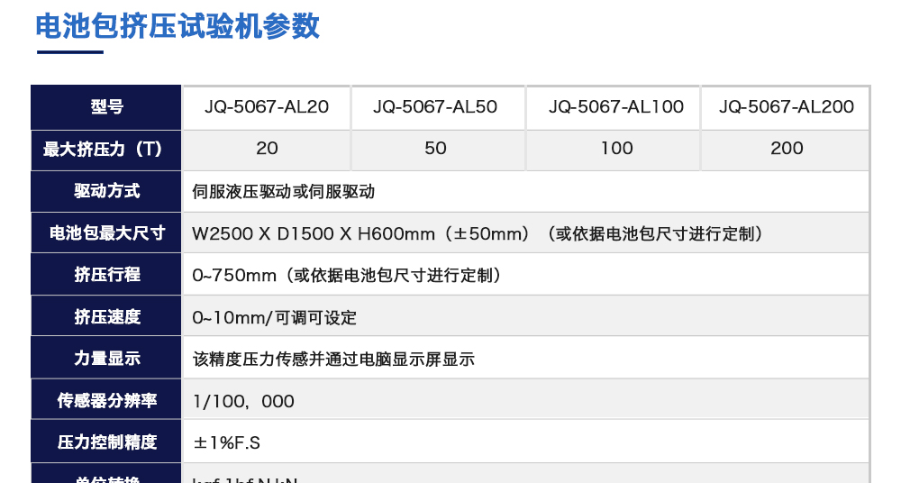 產品型號:JQ-5067-AL20 品牌:劍 喬 用途:電池包擠壓試驗機模擬各類動力動力電池包和系統在運輸、儲存及使用過程中電池包遭受碰撞擠壓的情形,人工呈現電池在遭受擠壓時可能出現的不同狀況。咨詢熱線:13829135130